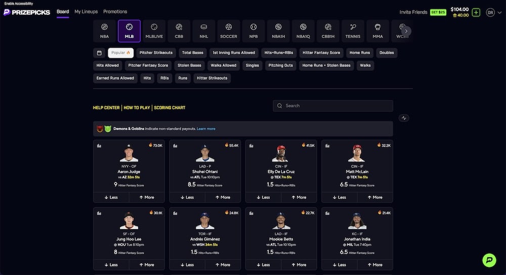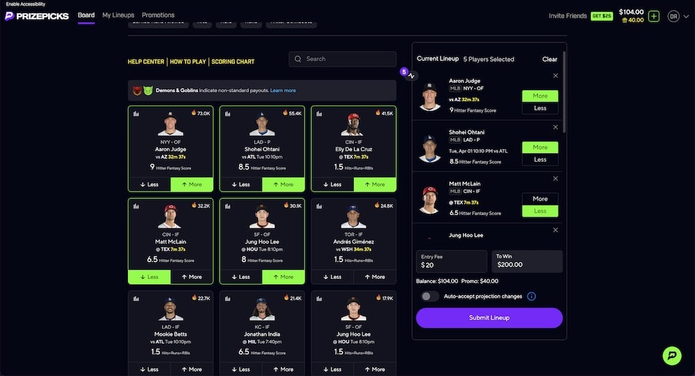 The platform is built entirely around Pick’em play. You choose 2 to 6 player projections and predict whether each will go More or Less. There are two game modes: