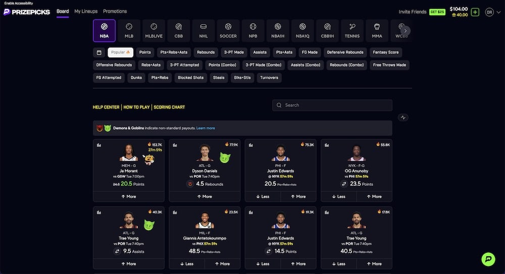 PrizePicks offers a max payout of 2,000x, but only if you hit 6 out of 6 picks—and all of them are Demon Picks. These projections are set higher than normal and always require you to choose More. For example, if Anthony Davis normally has a points projection of 30.5, his Demon projection might be 34.5. They’re tougher to hit, but they unlock the biggest payouts on the platform.