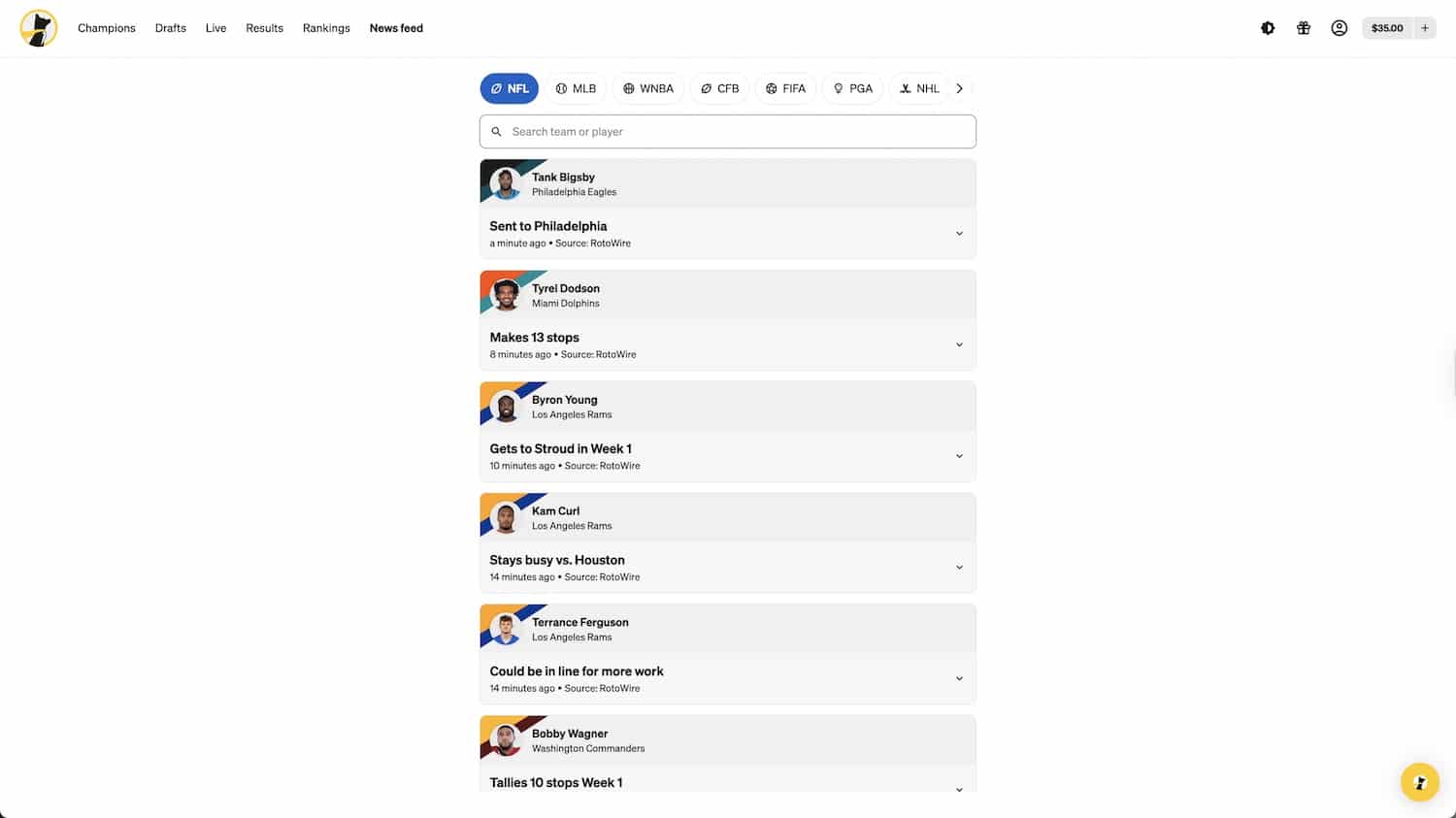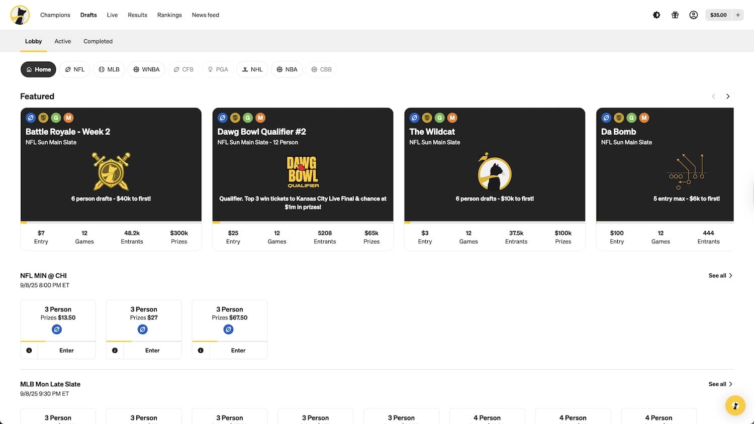 Once you log into the website or app, you’ll land on the Lobby page by default which shows featured tournaments and smaller drafts that you can enter. If you want to enter one, you simply click into it, confirm you want to enter, wait for the draft lobby to fill, then draft your team.