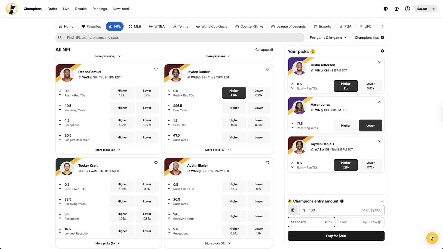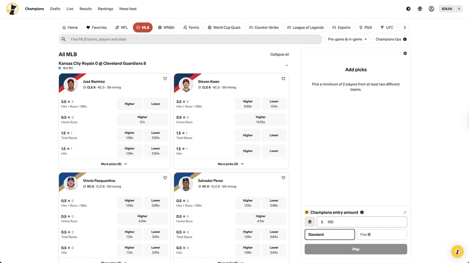 With Pick'em Champions, you create an entry of 2 to 5 picks where you choose higher or lower on player stats.