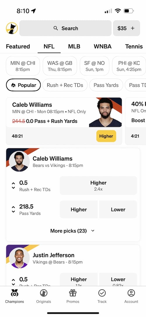 Aside from the welcome bonus, Underdog often offers specials and payout boots on their games. For instance, you may run into a boost offer in which getting all five picks correct in a Pick’em game results in a 60/1 payout instead of the usual 20/1.