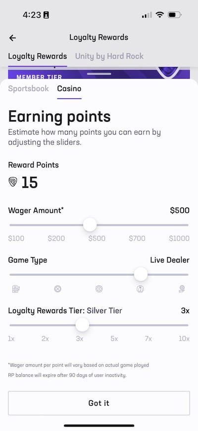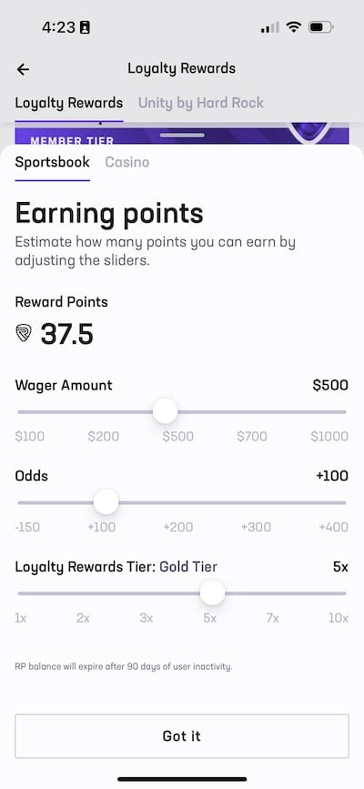 Hard Rock Bet offers a points calculator that you can use to figure out how many points your bets will earn. To access it, go to your account menu, then navigate to “Loyalty Rewards.” Inside, you’ll find customizable toggles for each of the three parameters.
